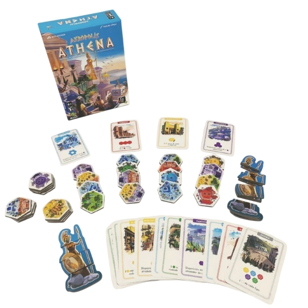 30 minifichas, 4 estatuas de Atenea, 18 cartas, 1 reglamento |