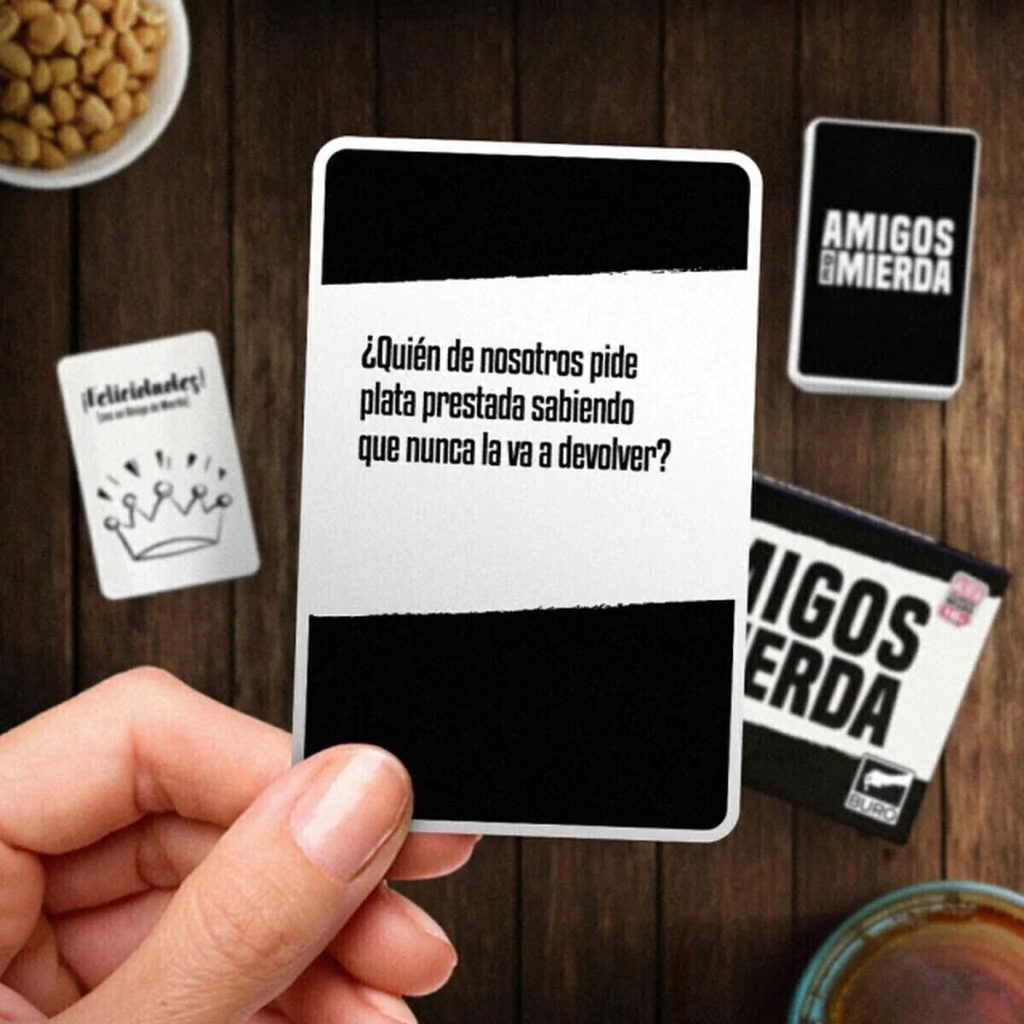 Amigos de Mierda es un juego rápido, ideal para llevar a las juntadas con tus amigos, en donde los jugadores sacan cartas al azar que contienen afirmaciones o preguntas sobre el carácter de alguien. Luego, a la cuenta de tres, cada jugador en la mesa señala a quien considera más adecuado para esa situación. La persona con más votos recibe la carta, y quien obtenga 5 cartas primero es coronado como el Amigo de Mierda.