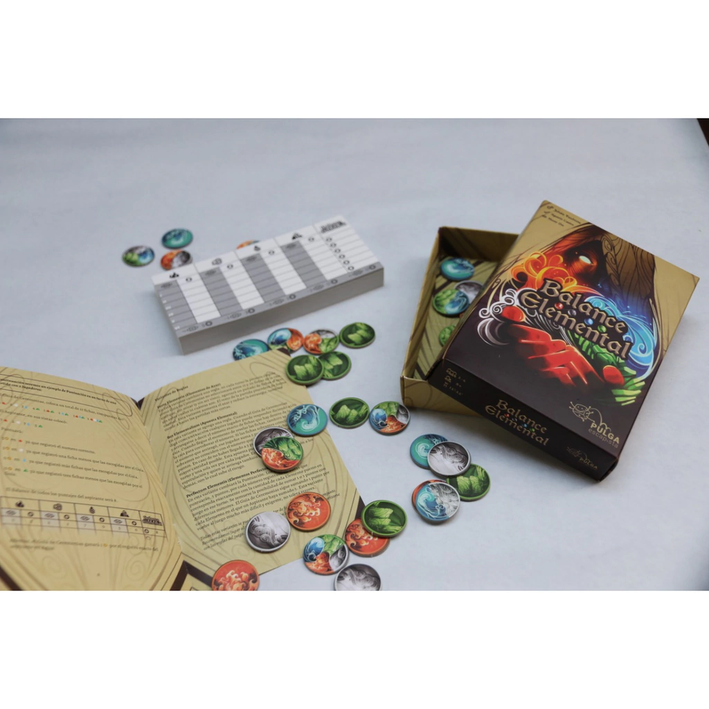 Cada jugador registrará en su Contador de Balance la cantidad de cada uno de los cuatro elementos naturales (agua, fuego, tierra y aire) que recuerda que estén presentes en la mesa. Luego, los jugadores puntúan según lo cerca que estuvo su estimación. Pero no es tan simple como parece porque algunas fichas combinan los elementos de maneras aleatorias y, además, si tu estimación es demasiado alta, vas a tener cero puntos.