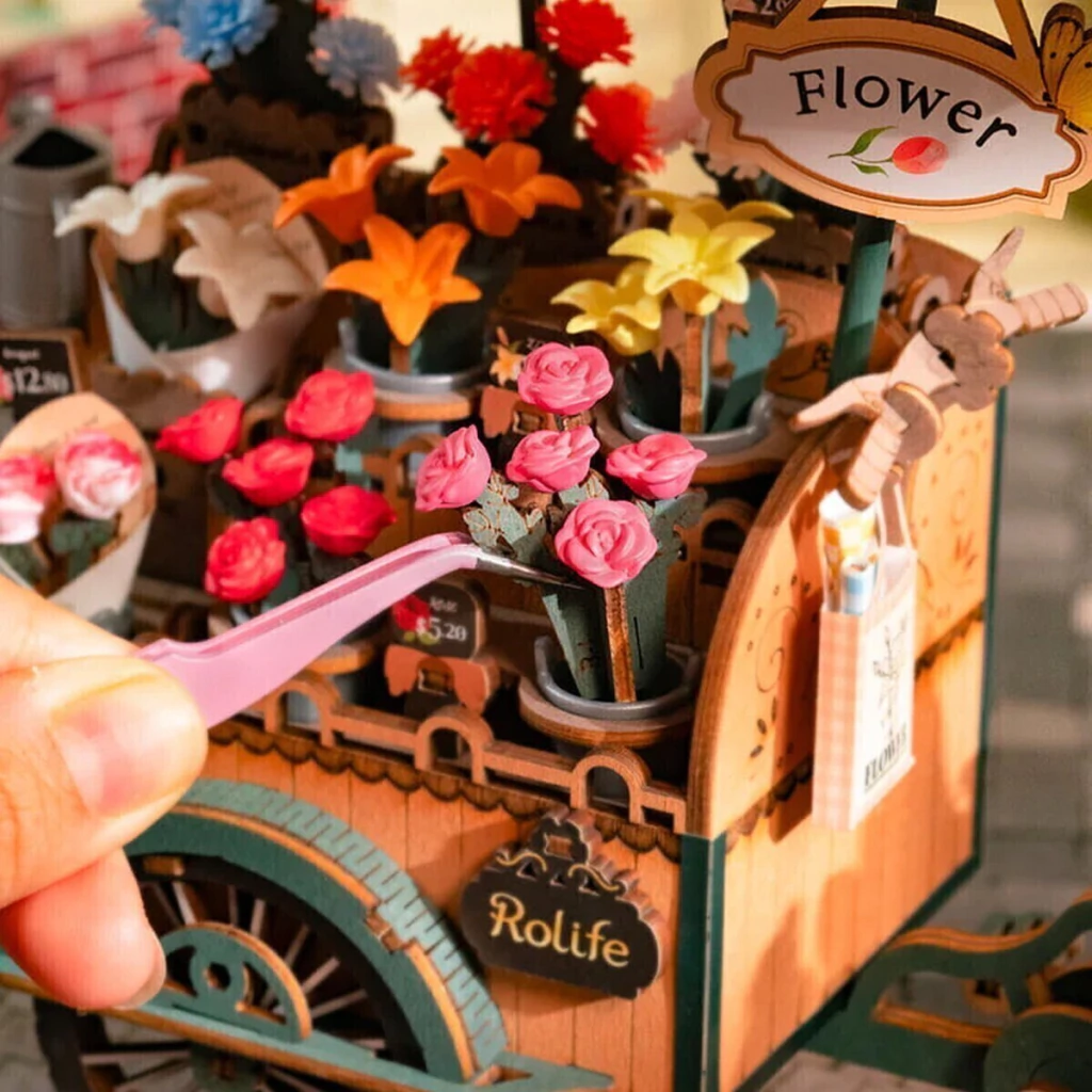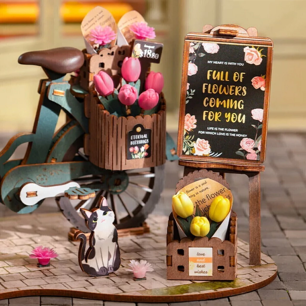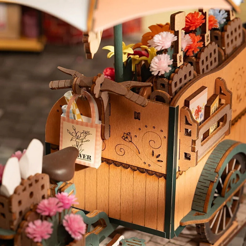 Es un puzzle 3D que representa a una florería ambulante, inspirado en las ciudades europeas donde las bicicletas con carritos de flores recorren las calles de los mercados ofreciendo ramos a los transeúntes.