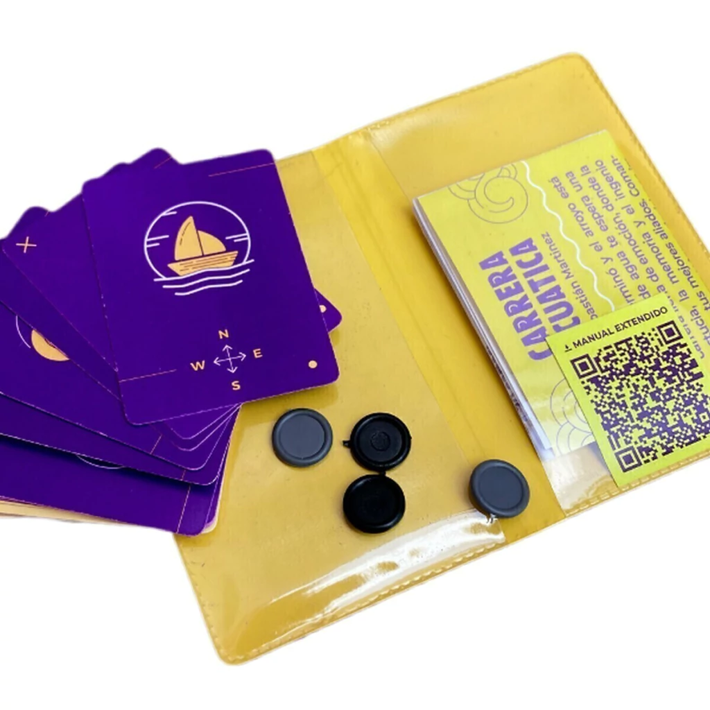 Carrera Acuática es un juego para dos jugadores en el que jugarán por turnos sus cartas para lograr colocar su carta de barco sobre la carta de ancla.