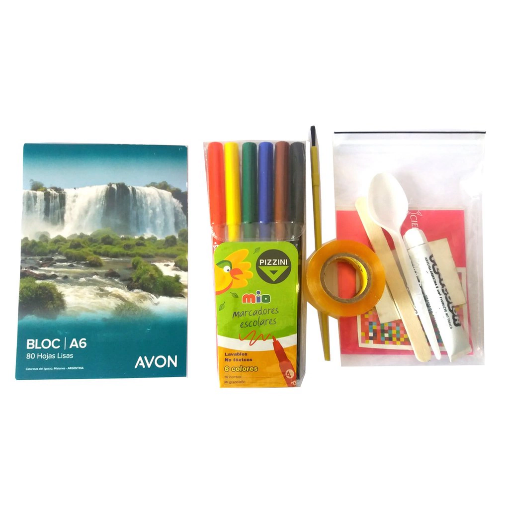 Kit para levantar huellas digitales, Lupa, Fichas para identificación de personas, Pincel, Cinta adhesiva, Bolsitas para evidencia, Kit para tomar moldes, Kit para mensajes secretos, Filtro rojo, Vaso plástico, Agitador, Tiras de papel secante, Marcadores, Anotador |