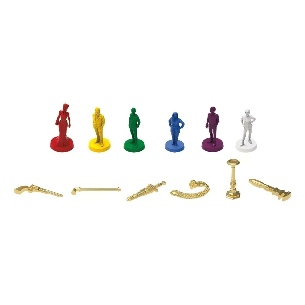 1 tablero, 6 tokens de personajes, 6 tokens de armas, 50 tarjetas (6 de personajes, 6 de armas, 9 de habitación y 29 tarjetas Clue), 1 sobre de la solución, 1 bloc de notas, 2 dados, instrucciones |