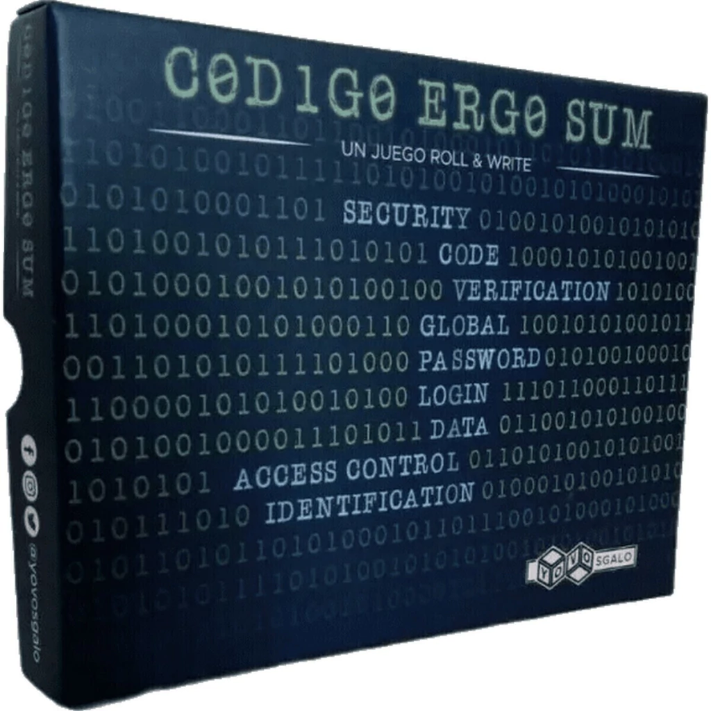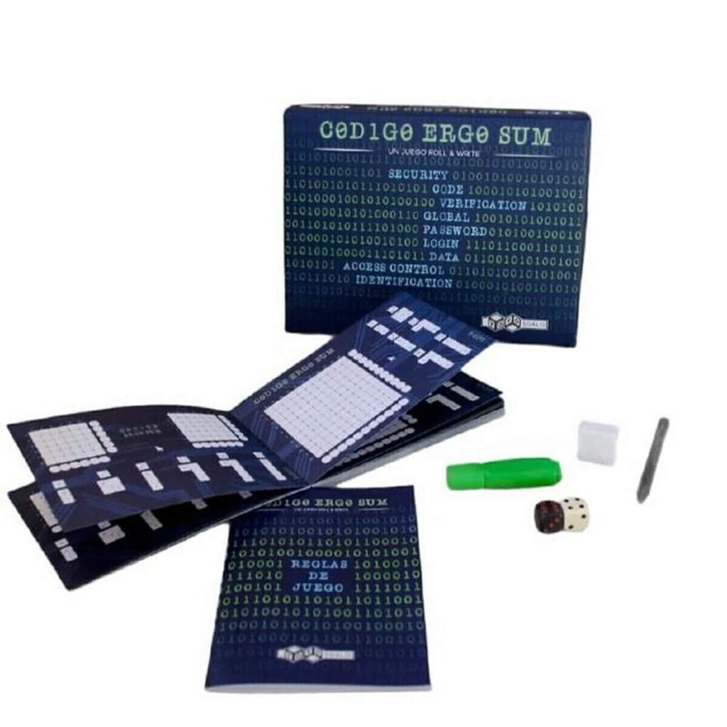 Código Ergo Sum es un juego en el que la estrategia y el azar se complementan durante toda la partida. Cada cara del dado representa una referencia a escribir en la hoja del juego, con el objetivo de establecer un código formado solo por 0 y 1 y así ayudar a Oliver Cazz, el mayor hacker de la historia.