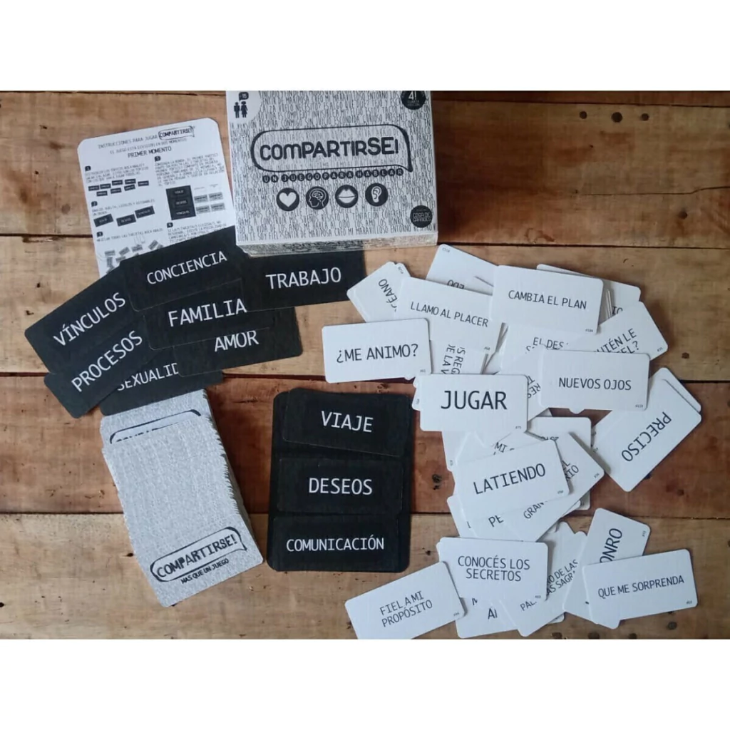 Compartirse es un juego que te propone conectarte primero hacia adentro y desde ahí para afuera a través de la combinación de pequeñas y gigantes tarjetas que te llevarán a un encuentro único e inolvidable por caminos nuevos con los grandes tópicos de la vida (amor, deseos, vínculos, viajes)