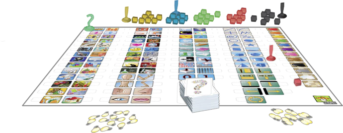 1 tablero con íconos universales, 5 conjuntos de peones (verdes, azules, rojos, amarillos, negros), 110 cartas de Concepto, Fichas de puntos de victoria Simples y Dobles, 4 ayudas de jugador, 1 recipiente de almacenamiento |