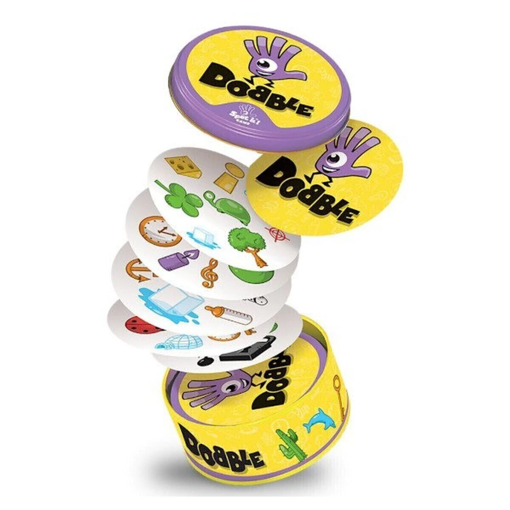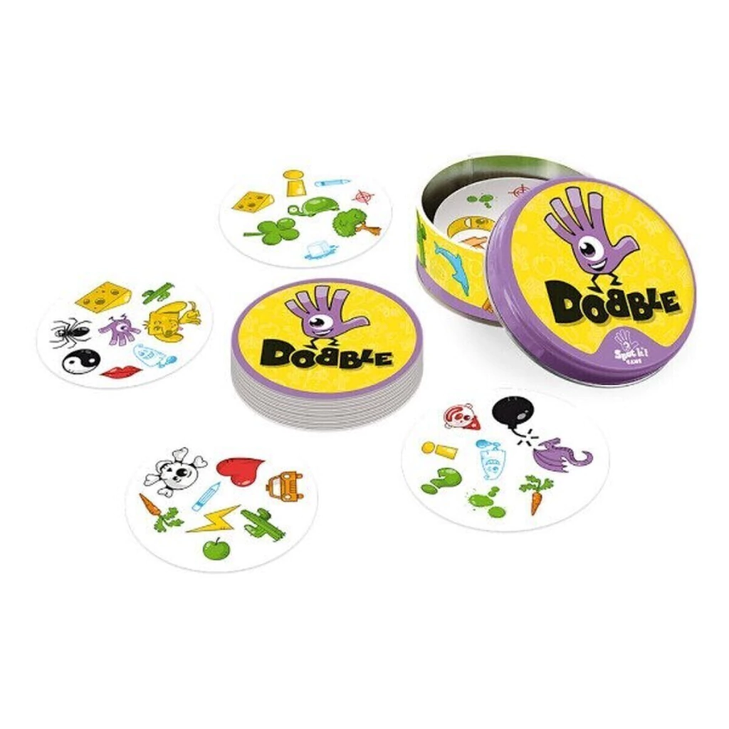 Dobble es un juego de cartas que se basa en la velocidad, observación y reflejos, en el que los jugadores compiten por encontrar el símbolo que coincide entre las cartas.