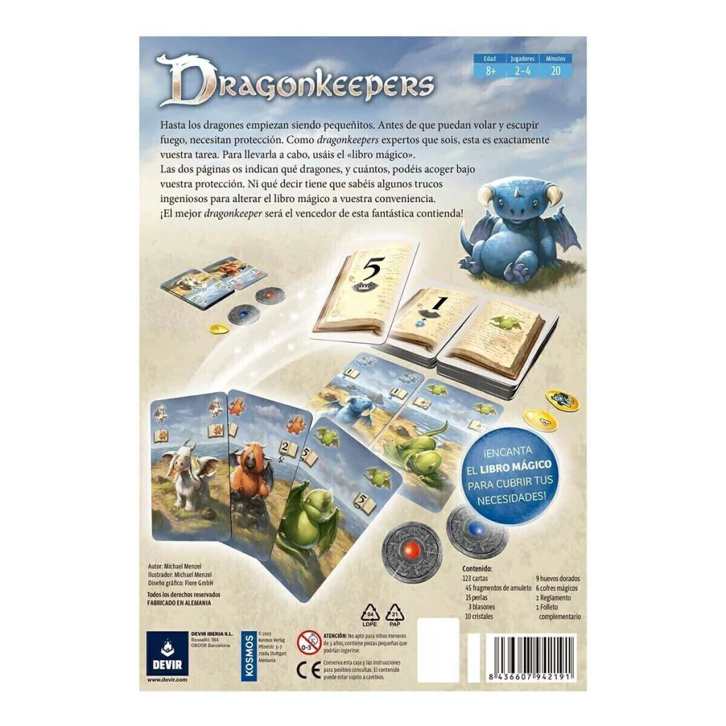 Dragonkeepers es un juego de cartas que usa un ingenioso sistema de dos barajas, que se colocan en el centro de la mesa, para formar el libro mágico. En la baraja izquierda se muestra un número y una recompensa, y en la baraja derecha un tipo concreto de dragón. En su turno, los jugadores deben jugar el número indicado de cartas de ese tipo de dragón en concreto para reclamar las recompensas (trozos de amuleto, huevos dorados, cristales o poderosos dragones sombríos) y así acumular puntos.