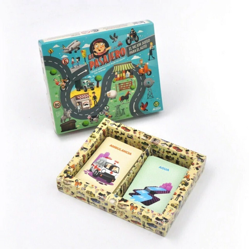 El Pasajero es el juego perfecto para tener en la guantera del auto. Consiste en dos mazos de 40 cartas, uno para la ruta y otro para la ciudad, con ilustraciones que los chicos deben encontrar mirando a través de la ventana. Se puede jugar solo, en equipos, o entre todos los pasajeros. Es el mejor antídoto para los viajes largos.