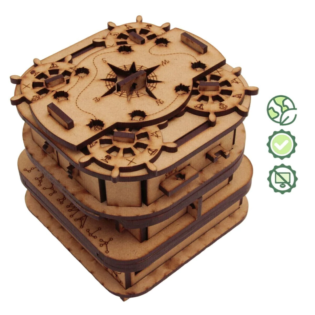 Escape Box 2 es una caja interactiva con varios acertijos que deben resolverse uno tras otro para abrir la caja. En otras palabras, esta caja es un escape room en un formato compacto. Todos los acertijos pueden ser resueltos mediante la lógica, no es necesario adivinar ni forzar los mecanismos. Su nivel de dificultad es experto.