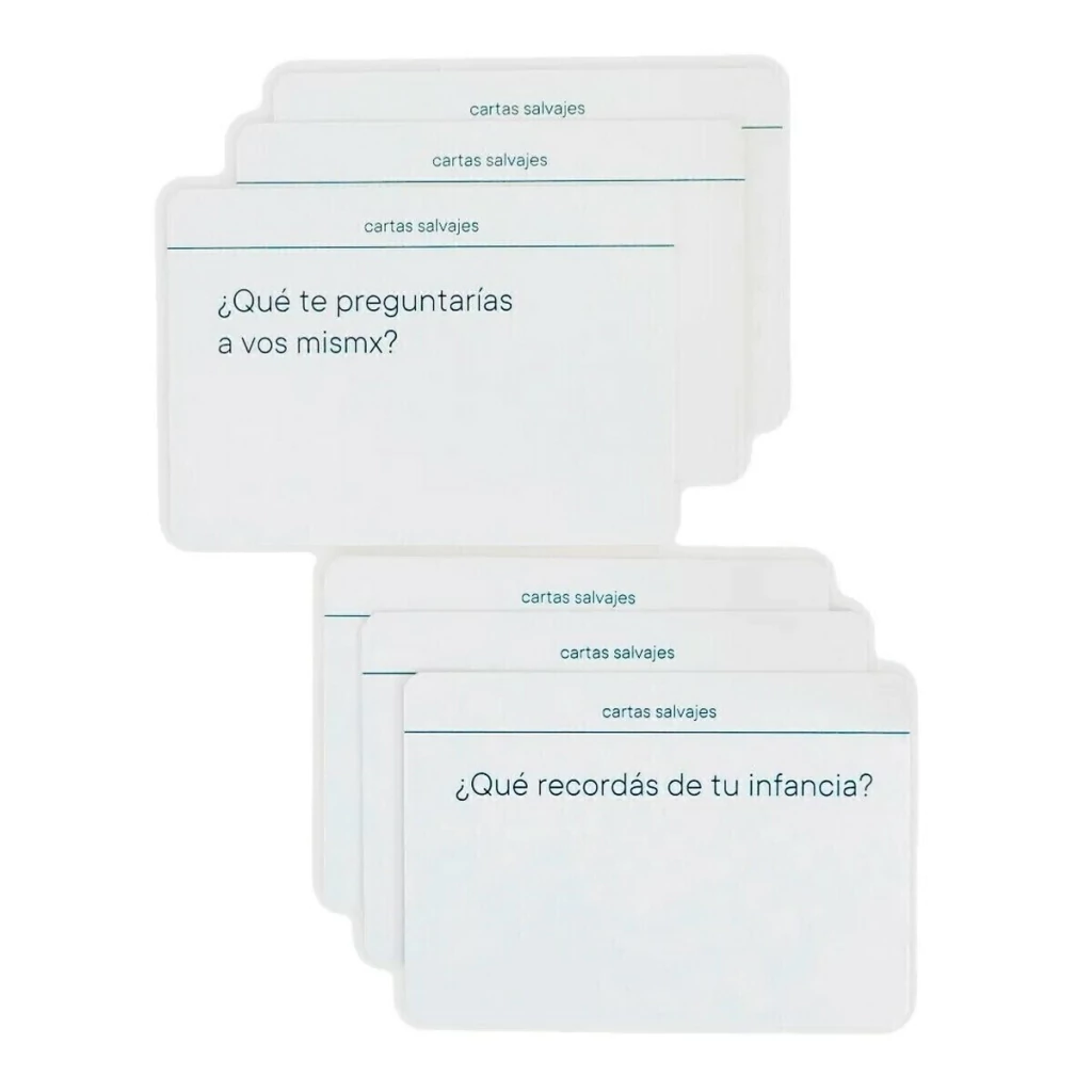 Cartas Salvajes es un juego de preguntas personales para romper el hielo, generar diálogos profundos y conocerte mejor con tus amigos o tu familia.
