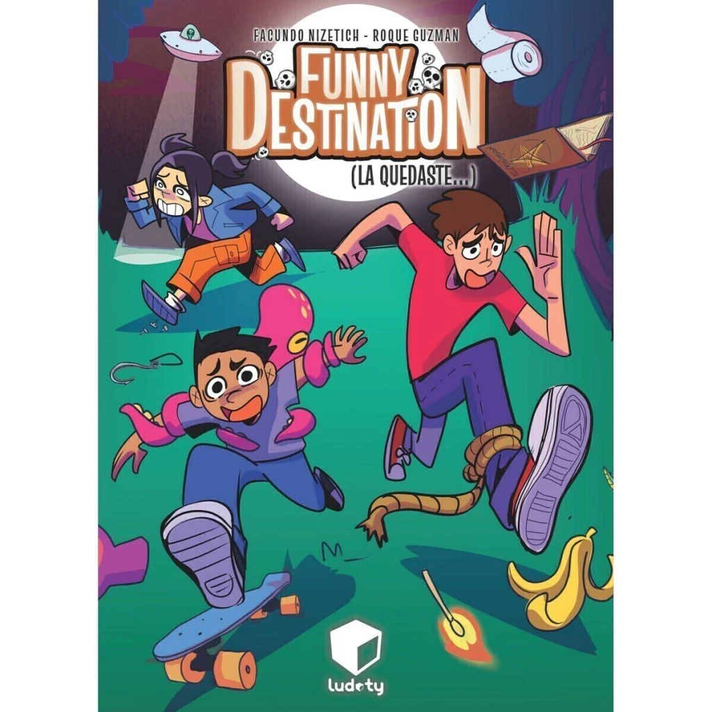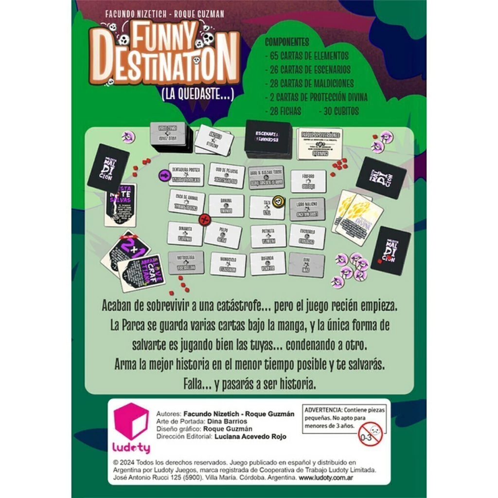 En Funny Destination (La Quedaste...) el objetivo es ser el jugador con menos muertes (cubitos rojos) al terminar la última ronda. En tu turno declarás un ataque a otro jugador. Los demás pueden jugar fichas y/o una carta de maldición. El jugador atacado toma una carta de escenario, elige uno de los dos escenarios y anuncia la hora de su muerte. Comienza la cuenta regresiva. Tenés que contar tu historia antes de que se acabe el tiempo. Contá la mejor historia en el menor tiempo posible y estarás a salvo. Fallá y serás historia.