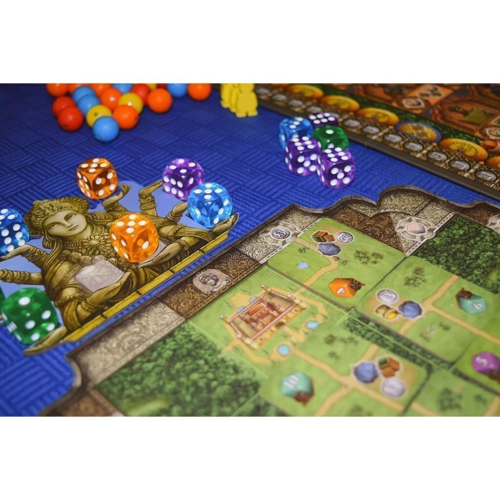 1 tablero, 48 dados, 24 lacayos, 4 tableros de provincia, 64 losetas de provincia, 30 fichas de producción, 20 cubos, 4 bustos de Kali, 4 barcos, 4 indicadores de riqueza y 4 de gloria, 4 fichas de bonificación, 1 elefante, 8 fichas de río |