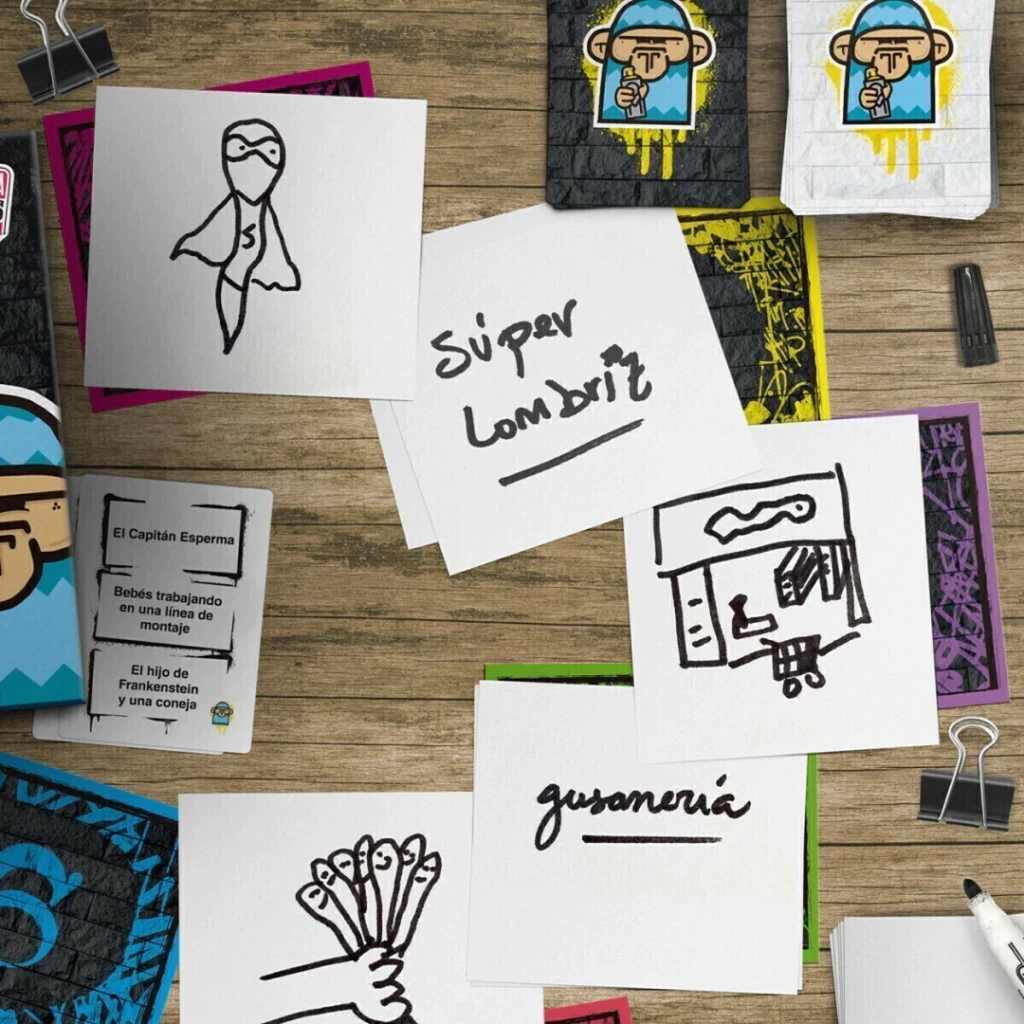 Agarrá una carta, elegí una consigna y dibujala. Después, pasale tu dibujo al de al lado para que escriba, en secreto, qué piensa que es, mientras vos recibís el dibujo de otro y los interpretás. Así, se van a ir pasando dibujos e interpretaciones entre todos y los dibujos originales se van a distorsionar completamente. Al final, van a votar para dar premios y ver quién gana cada uno.