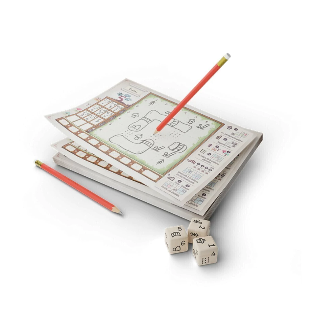 1 Bloc de 100 hojas doble faz, 3 Dados de madera personalizados, 4 Lápices con goma, 1 Reglamento |