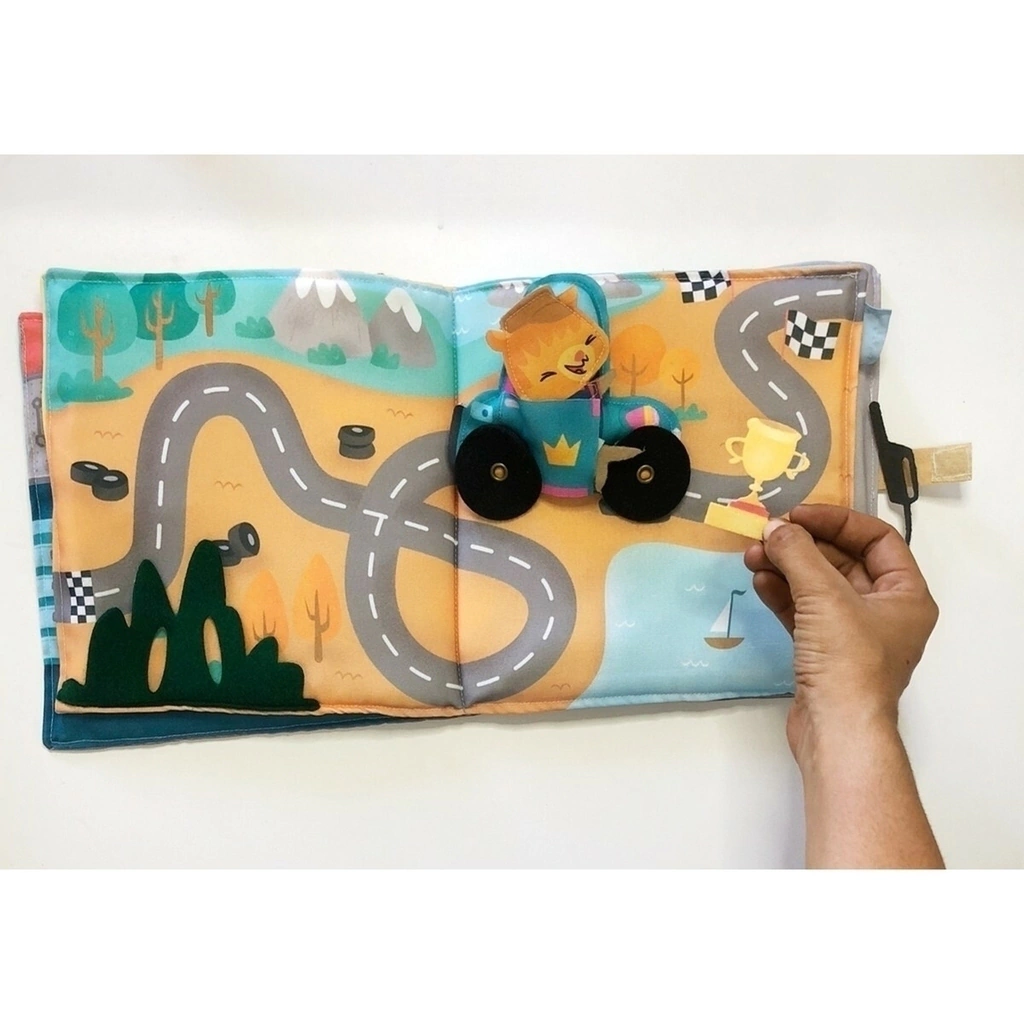 Es un libro de tela sensorial con la historia de un gatito que ama los autos y las aventuras.