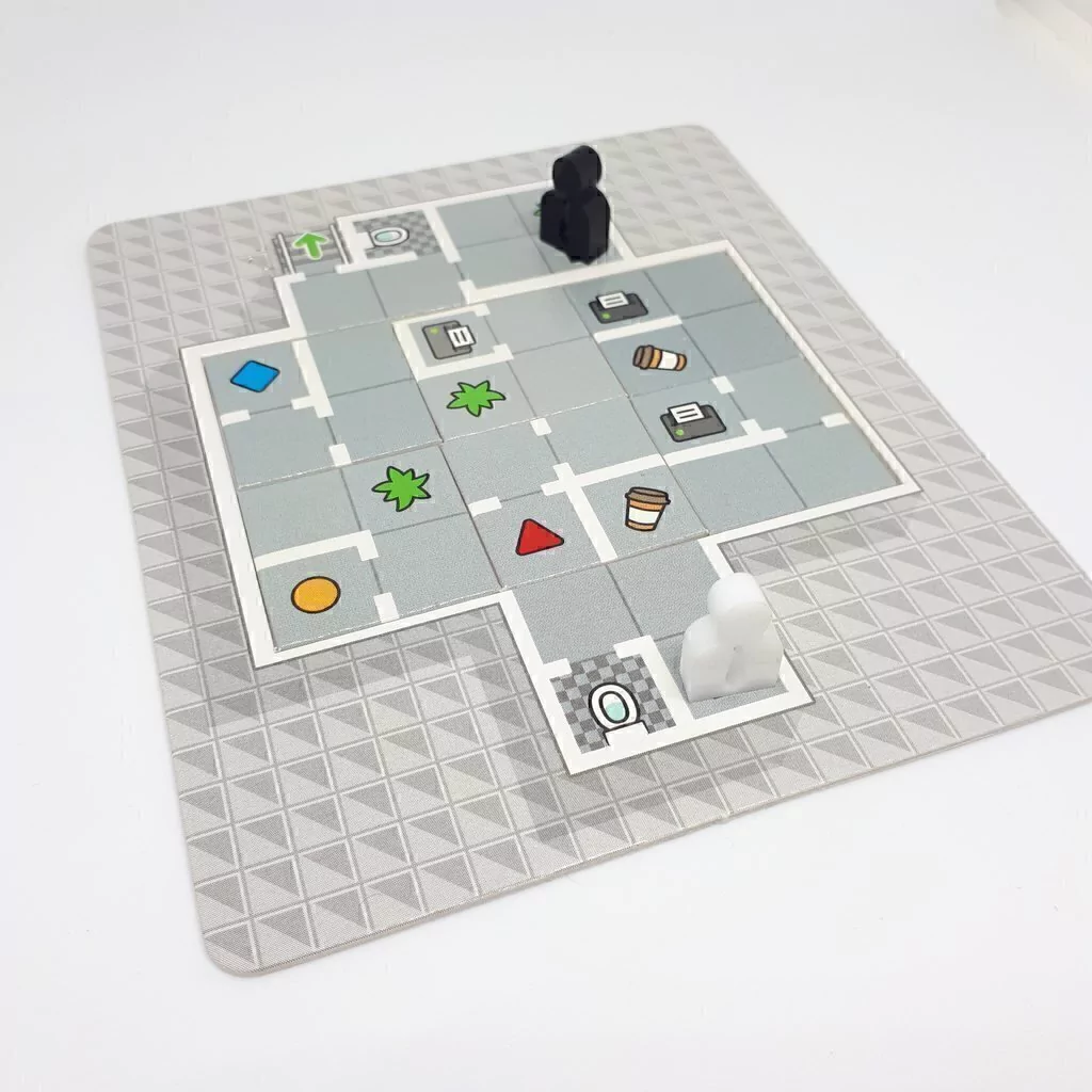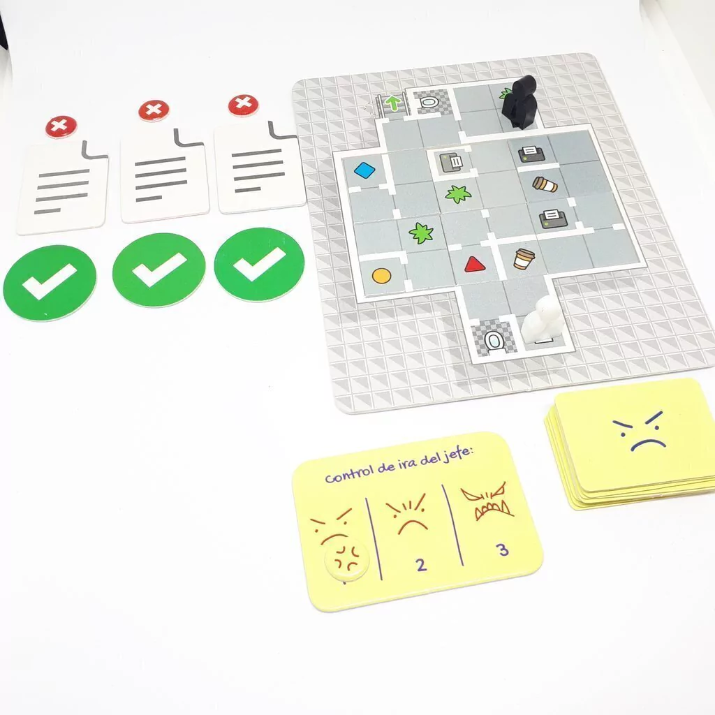 1 tablero, 6 losetas de oficina, 3 informes, 9 acciones del jefe, 1 contador de ira del jefe, 5 objetos recompensa, 2 fichas de personaje, 4 tokens marcadores, 1 reglamento |