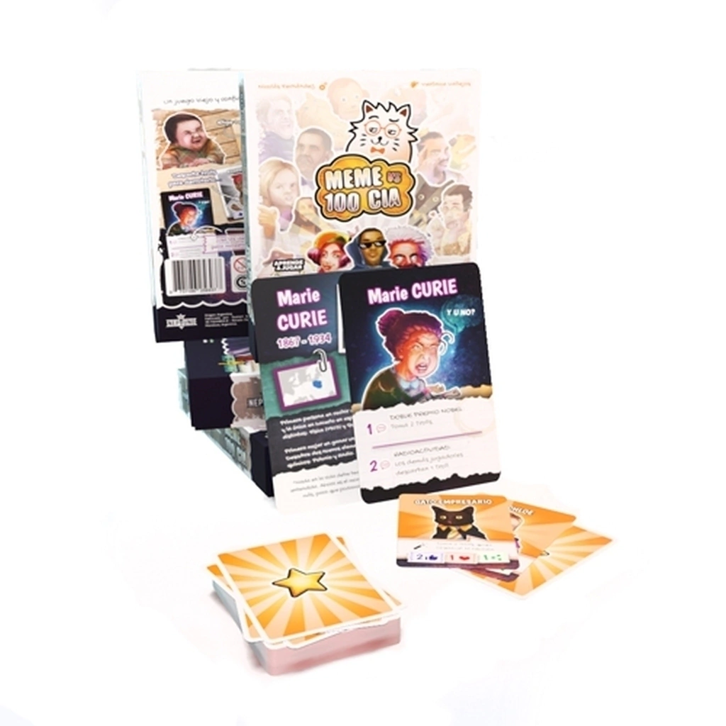 Meme vs 100cia es un juego de cartas rápido en el que cada jugador representa a un Científico que debe conseguir 3 estrellas para ganar.