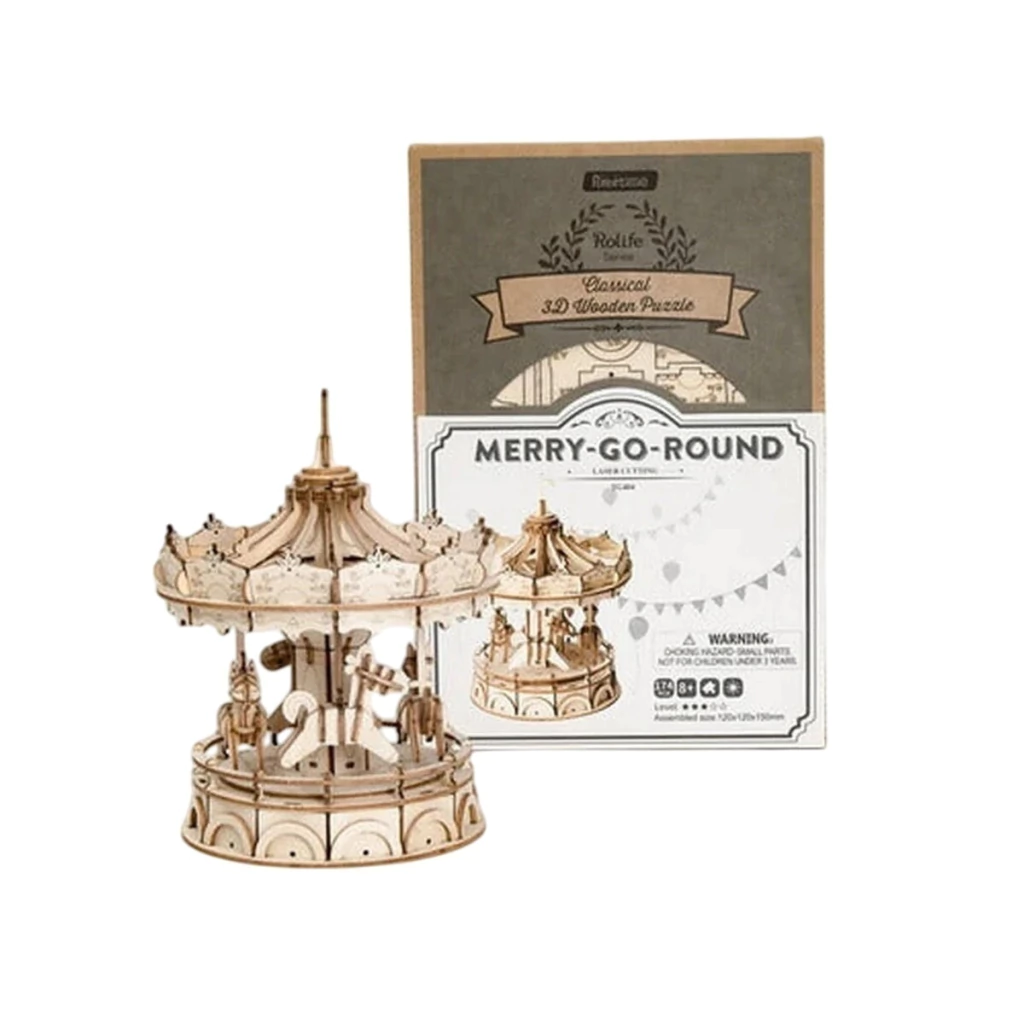 Es un puzzle 3D de madera que te invita a construir una calesita en miniatura. El modelo cuenta con 174 piezas de madera precortadas por láser, ensamblables sin necesidad de pegamento.