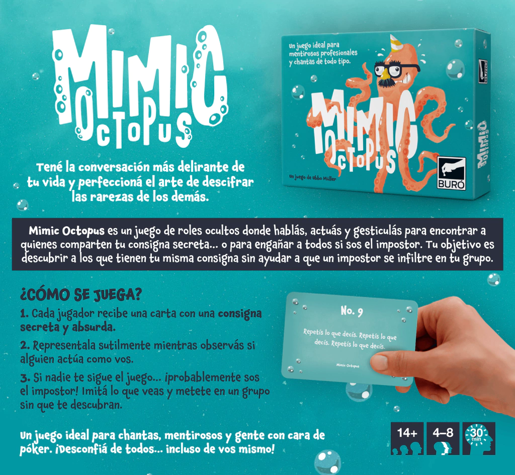 Mimic Octopus es un juego de roles ocultos donde hablás, actuás y gesticulás para encontrar a quienes comparten tu consigna secreta... o para engañar a todos si sos el impostor. Tu objetivo es descubrir a los que tienen tu misma consigna sin ayudar a que un impostor se infiltre en tu grupo.