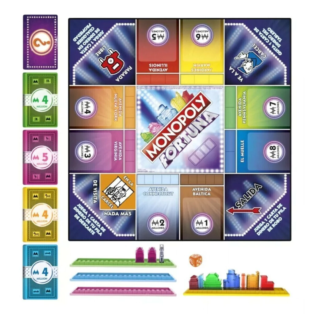 Monopoly Fortuna es la versión de alto riesgo y cartas del clásico Monopoly. En este juego, en vez de mover una ficha por el tablero, cada jugador recibe un mazo con cartas de Dinero, cartas de Bancarrota y cartas estratégicas que te dan ventaja. Tirás el dado y das vuelta hasta esa cantidad de cartas. Podés ir a lo seguro y revelar solo las cartas necesarias para "cobrar", o jugártela y arriesgar todo para llevarte el gran premio. Pero ojo, ¡si te pasás, puede aparecer una carta de Bancarrota!
