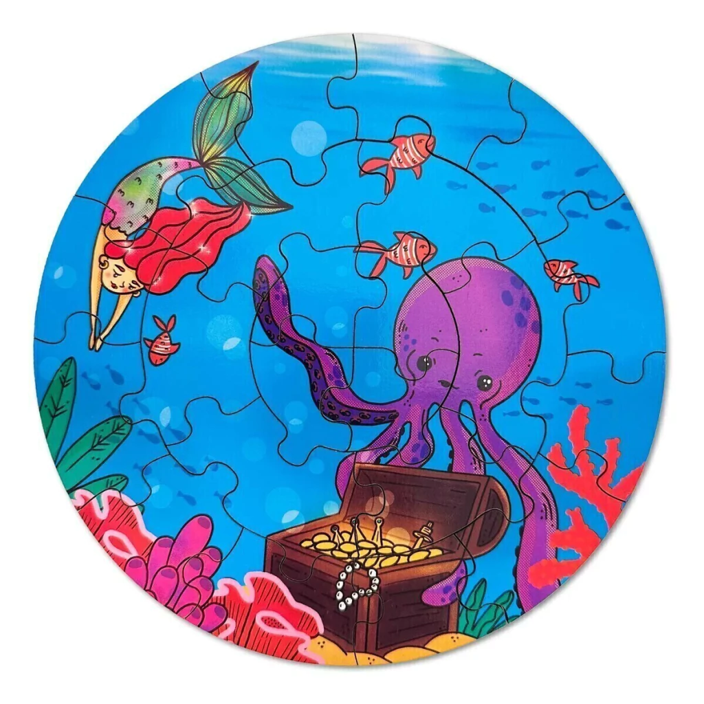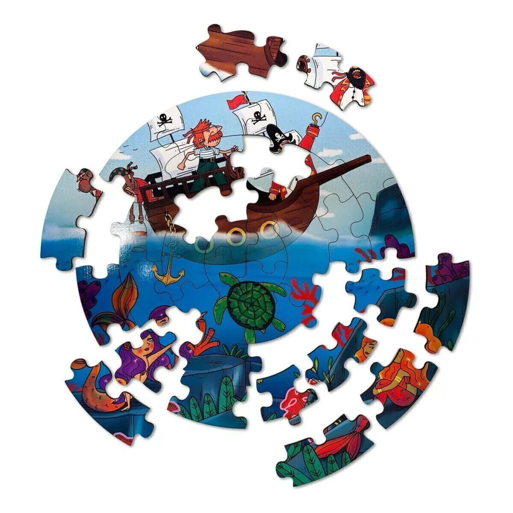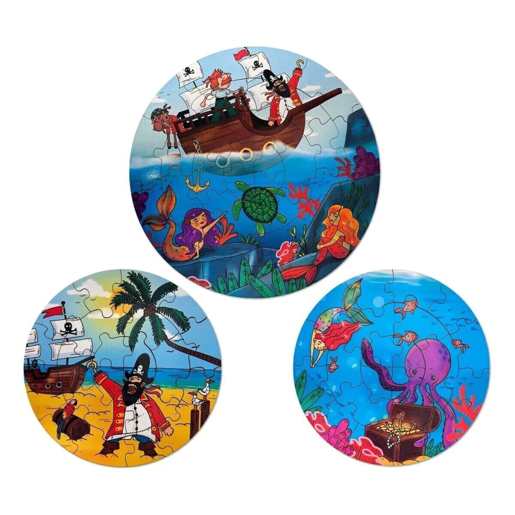 Son 3 rompecabezas circulares de madera. Incluye uno de 39 cm de diámetro de 34 piezas y dos de 20 cm de diámetro de 22 piezas cada uno.