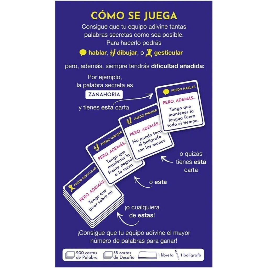 El objetivo es lograr que tu equipo adivine la mayor cantidad de palabras secretas posible antes de que se acabe el tiempo. Para eso podés hablar, dibujar o hacer mímica. ¡Pero ojo! Cada carta trae un giro extra que va a hacer tu tarea un poco más difícil... y mucho más divertida.