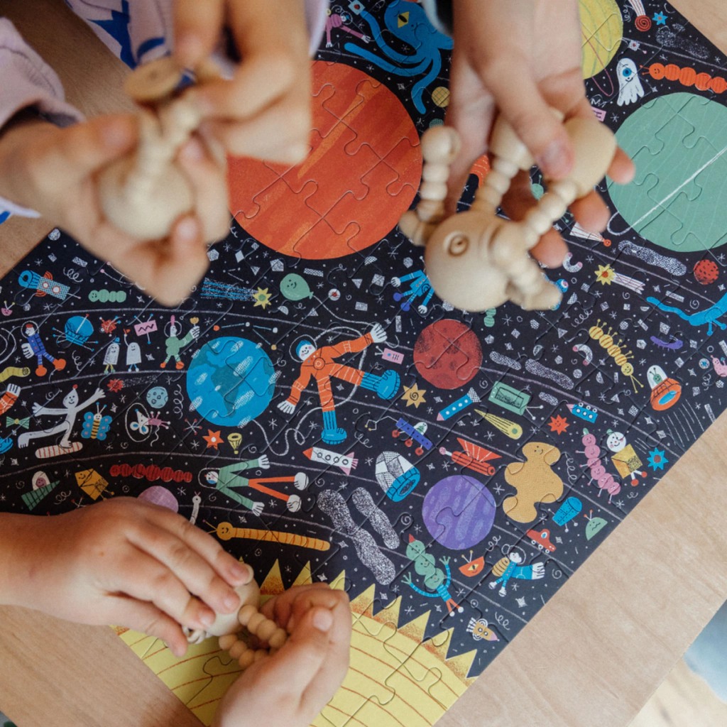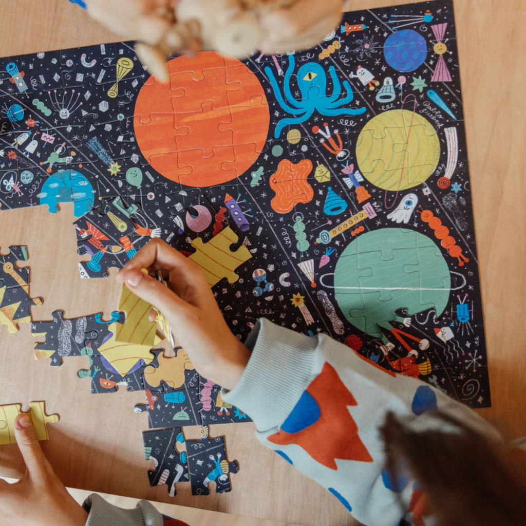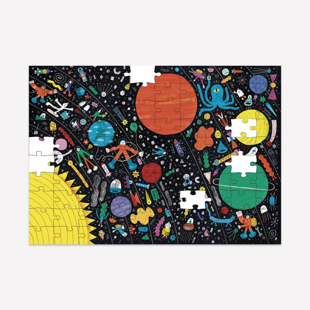 En un viaje cósmico desde el sol hasta Urano pueden pasar muchas cosas. Ideal para los peques curiosos del espacio, este puzzle presenta el sistema solar con todos sus planetas y varios invitados estelares.