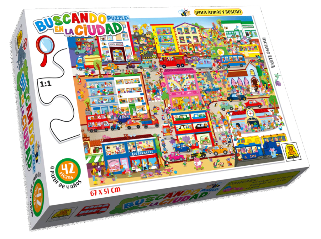 Buscando en la ciudad es un juego educativo e interactivo. Más que un simple rompecabezas, este juego combina la diversión de armar un puzzle con la emoción de una búsqueda. Al completarlo, los niños pueden usar la lupa incluida para explorar cada detalle de la ciudad y descubrir todo lo que sucede en ella.
