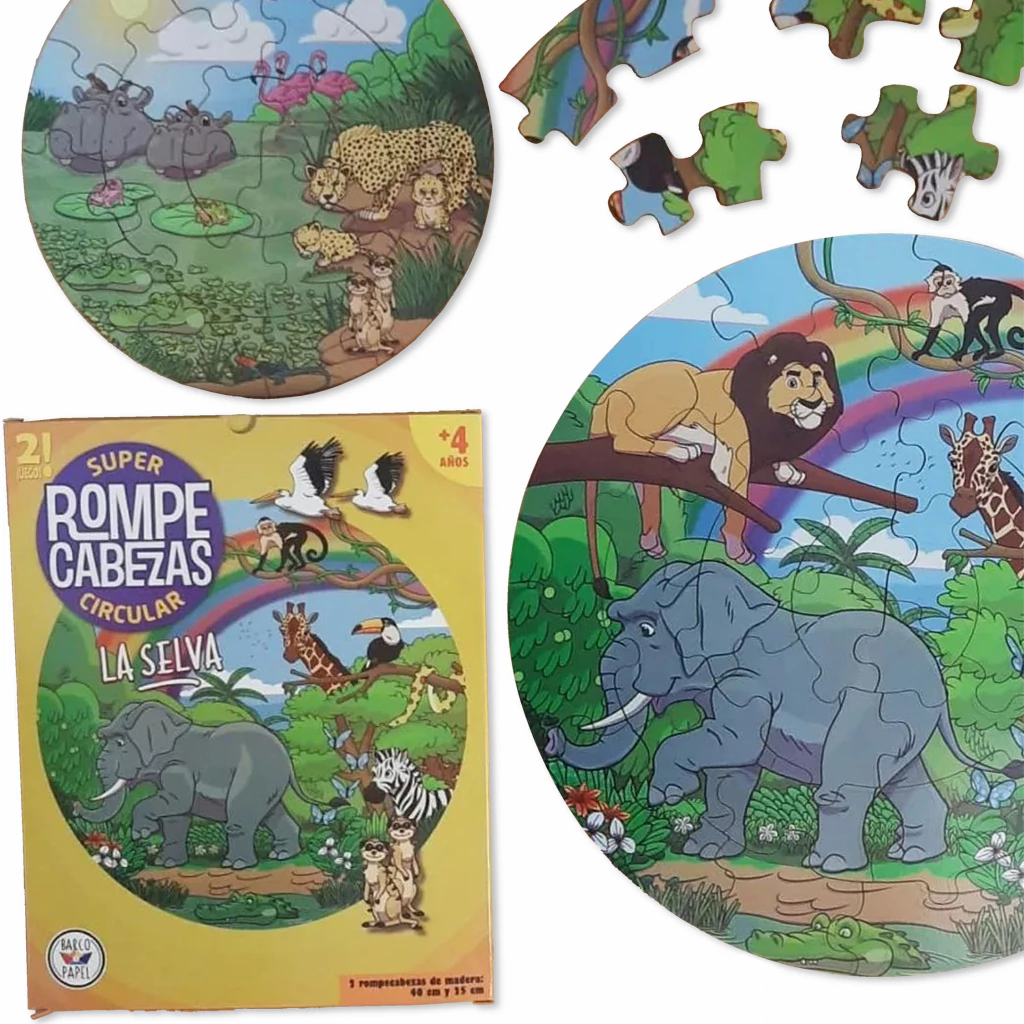 Son 2 rompecabezas circulares de madera. Incluye uno de 40 cm de diámetro y otro de 25 cm de diámetro.