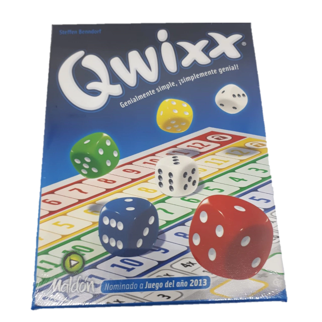 Qwixx es un juego de dados rápido en el que todos participan, sin importar de quién sea el turno. Cada jugador tiene una hoja de puntuación con los números del 2 al 12 en filas de color rojo y amarillo, y los números del 12 al 2 en filas de color verde y azul. Para ganar puntos, tenés que marcar la mayor cantidad de números posible, pero solo podés marcar un número si está a la derecha de todos los números marcados en la misma fila.