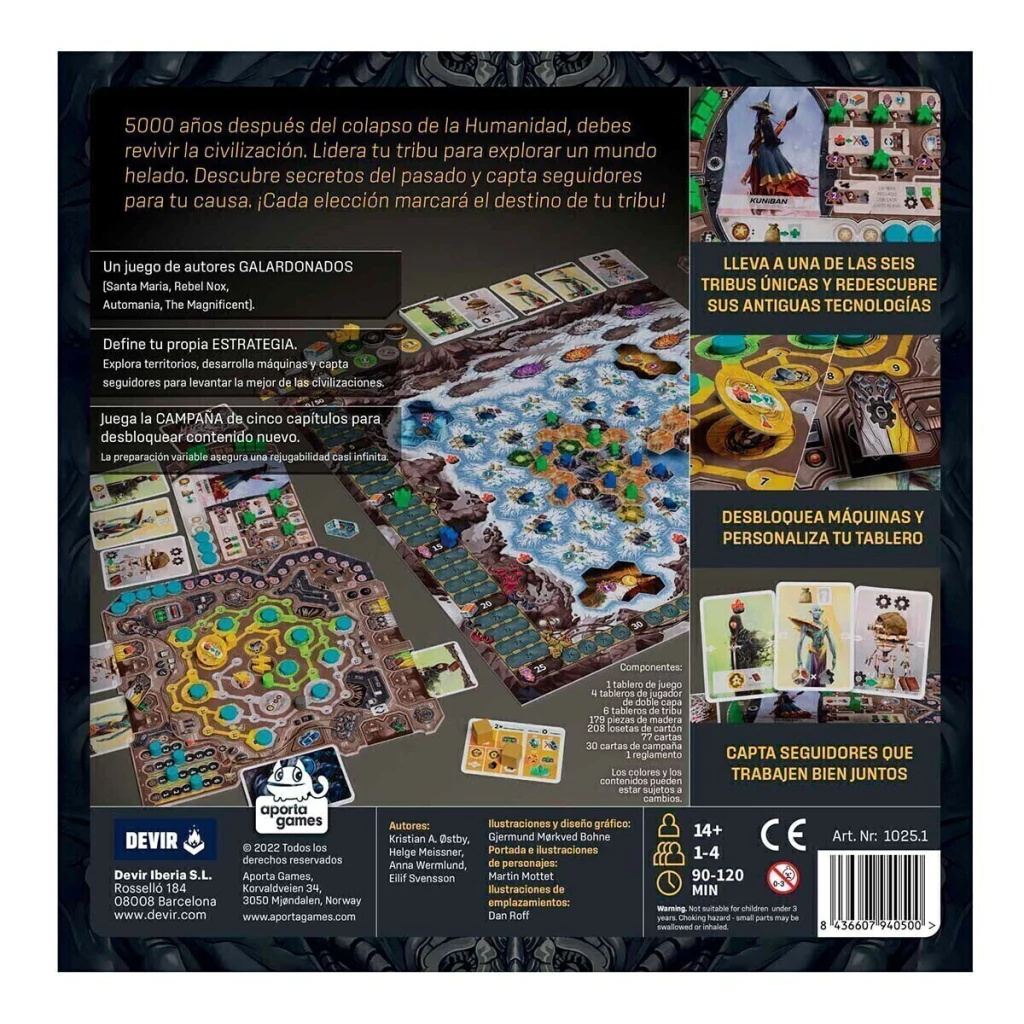 1 tablero de juego, 4 tableros de jugador doble capa, 6 tableros de tribu, 179 piezas de madera, 208 losetas de cartón, 77 cartas, 30 cartas de campaña, 1 reglamento |