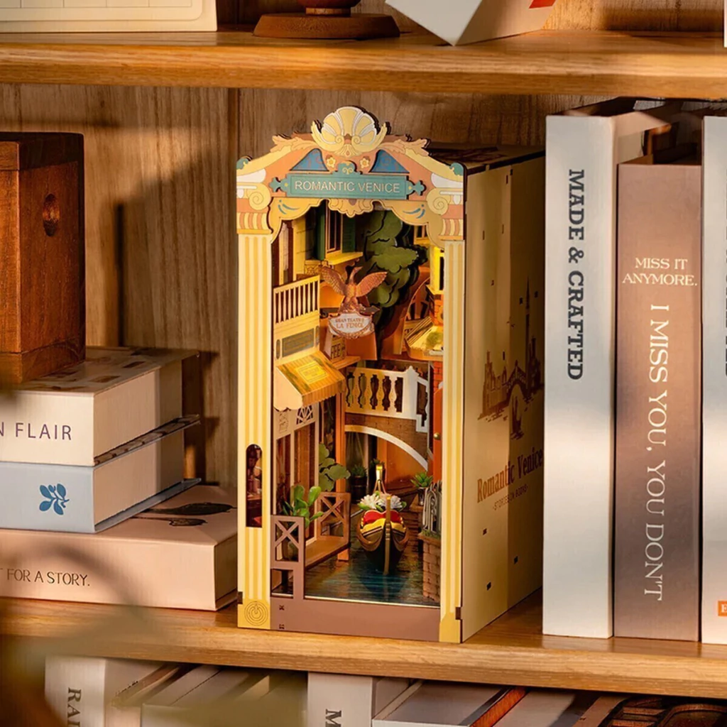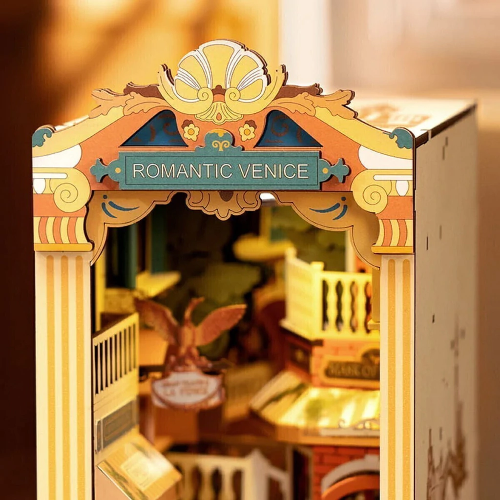 Romantic Venice es una escena decorativa para armar que se coloca entre los libros en la biblioteca. Recrea una hermosa escena de la ciudad de Venecia. Con iluminación, cubierta antipolvo y un diseño lleno de detalles, es una pieza decorativa creativa y un modelo para armar tan encantador como elegante.