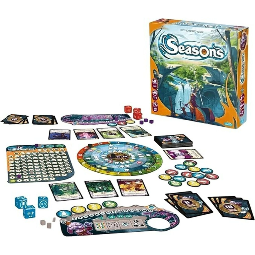1 tablero de juego, 1 contador de cristales, 1 ficha de año y 1 ficha de estación, 8 fichas de biblioteca, 4 tableros individuales, 16 fichas de hechicero, 20 dados de estación, 40 cartas de poder avanzadas, 60 cartas de poder básicas, 64 fichas de energía, 1 reglamento |