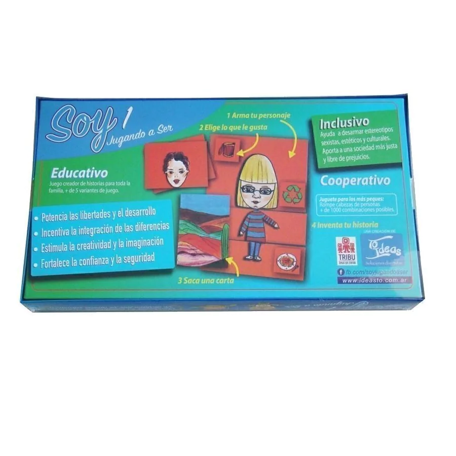 Soy Jugando a Ser 1 es un juego donde podés armar una diversidad enorme de personas, colocándole sus gustos, actividades, viajes y después inventar historias. Con las piezas podés hacer 1000 combinaciones de juego.