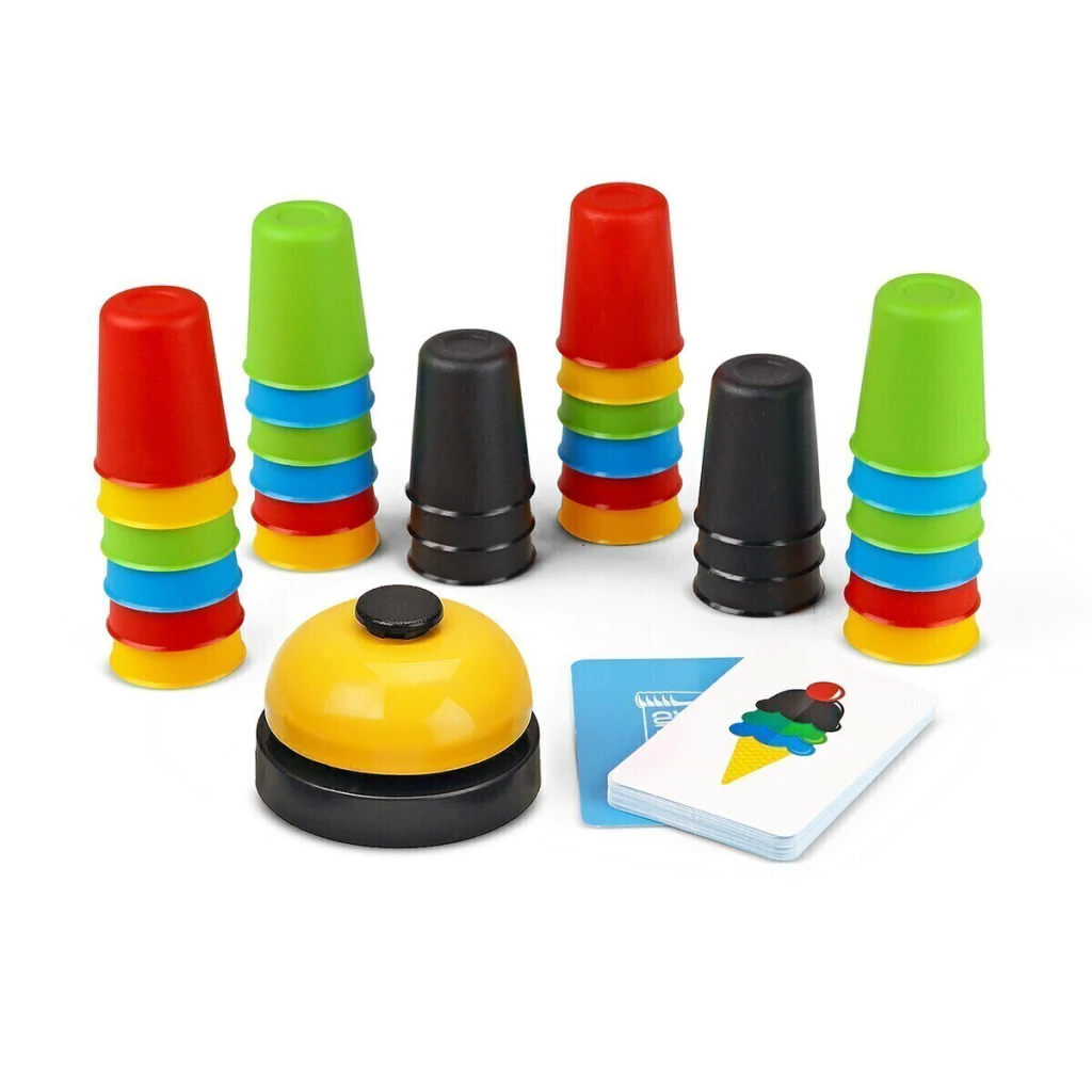Se reparte un cubilete de cada color a cada jugador y se coloca el mazo de cartas y el timbre en el centro de la mesa. En cada turno, se revela una carta y todos deben colocar los cubiletes en el orden indicado por la carta. El primer jugador en completar el orden debe tocar el timbre para ganar la carta como recompensa. El juego continúa hasta que se acaben las cartas, y el jugador con más cartas al final será el ganador.