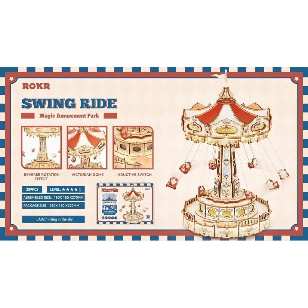 Es un rompecabezas 3D de madera con caja musical y luces para armar. Su diseño está inspirado en las clásicas sillas voladoras de los parques de diversiones. Al tocar un botón, el techo del carrusel comienza a girar, las sillas se balancean al compás de la música y se encienden las luces, creando un espectáculo encantador.