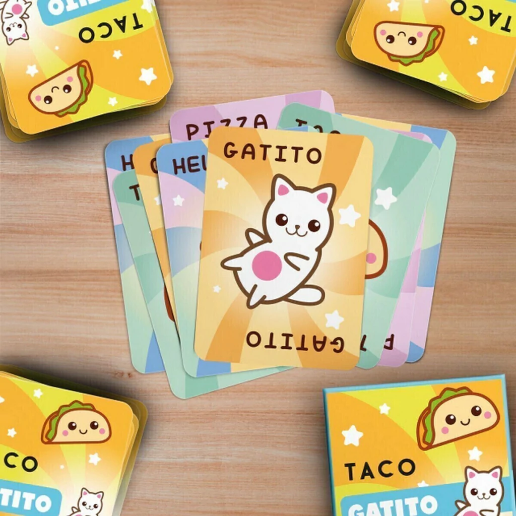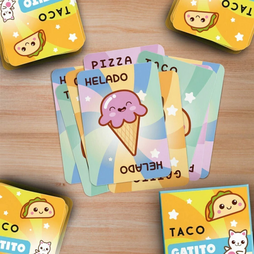 Primero, tenés que decir en voz alta una de las tres palabras del nombre del juego (la que quieras: taco, gatito o pizza) y después tenés que dar vuelta tu carta. Si la palabra que dijiste coincide con la carta, jugás de nuevo y elegís otra vez una de las tres palabras. Cuando aparece el Helado, todos ponen las manos arriba de la carta. El último se lleva todas las cartas de la pila.