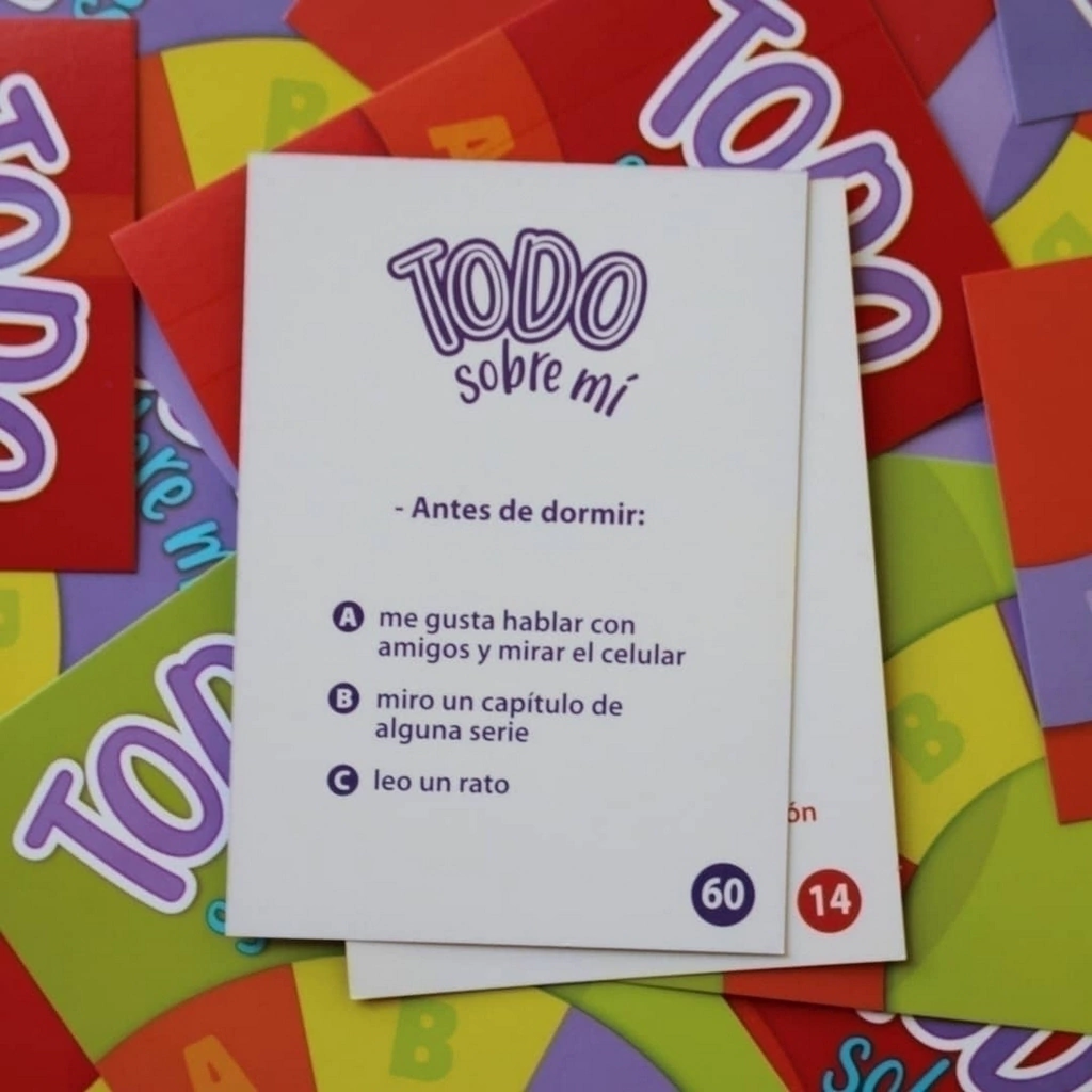 Todo Sobre Mí es un juego para socializar y generar empatía entre todos los participantes. Ideal para adolescentes y adultos que quieren divertirse intentando adivinar qué piensan los demás. Cuanto mejor conozcas a los jugadores, más chances tendrás de ganar, y si no, tendrás que arriesgar tus respuestas, haciendo el juego aún más divertido.