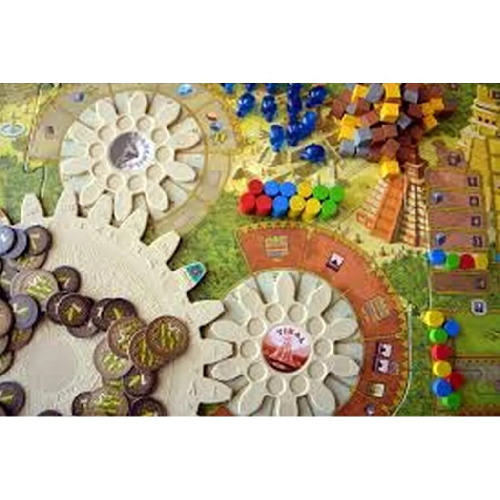 1 tablero de juego compuesto por 6 piezas, 6 engranajes de varios tamaños, 1 hoja con pegatinas, 6 pasadores de plástico, 24 trabajadores en 4 colores (6 por jugador), 28 marcadores en 4 colores (7 por jugador), 4 contadores de puntuación (1 por jugador), 65 cubos de madera para representar los recursos (madera, piedra y oro), 13 calaveras de cristal en plástico, 65 marcadores de maíz con valores 1 o 5, 21 losetas de riqueza inicial, 13 monumentos, 32 edificios divididos en dos eras, 4 tableros individuales con doble cara en 4 colores, 1 marcador de jugador inicial, 1 reglamento |